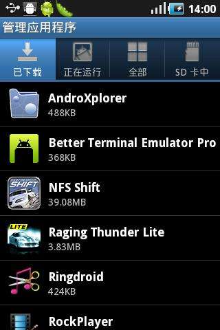 我们的三星S5660手机采用的是安卓2.2系统,可以部分实现APP2SD。在手机的主菜单-设置-应用程序-管理应用程序-已下载中显示了我们已经安装在手机里的软件。随意打开其中一个软件,我们可以看到“强行停止”、“卸载”等选项,有一项“移至SD”卡就可以实现把软件移动到存储卡,不占用手机ROM。但可以支持这一功能的只有RockPlayer、PSP模拟器等少数软件,大部分软件的这一选项是不可用的,也就是说还是不能安装到TF卡上。而S5660的ROM只有160M,面对上万款动辄十几兆几十兆的安卓软件,实在是有些力不从心。因此,九天在试飞开始后一直在网上查找资料,研究如何彻底实现APP2SD,并最终获得成功。下面我就一步步向大家介绍。