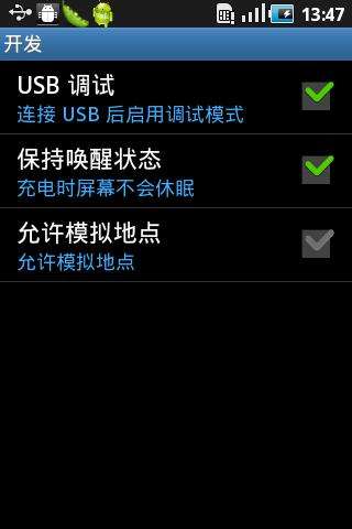 2. 同样与《易筋经》中一样,主菜单-设置-应用程序-开发-USB调试,在前面的小框里打勾,启动手机的USB调试,这时电脑应该已发现新硬件并找到了手机。(已完成root的这一步同样可以跳过)