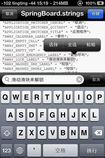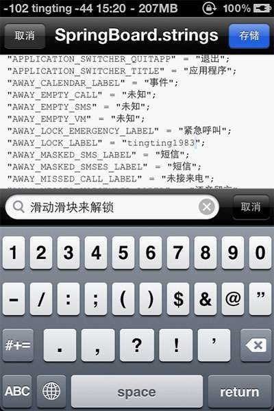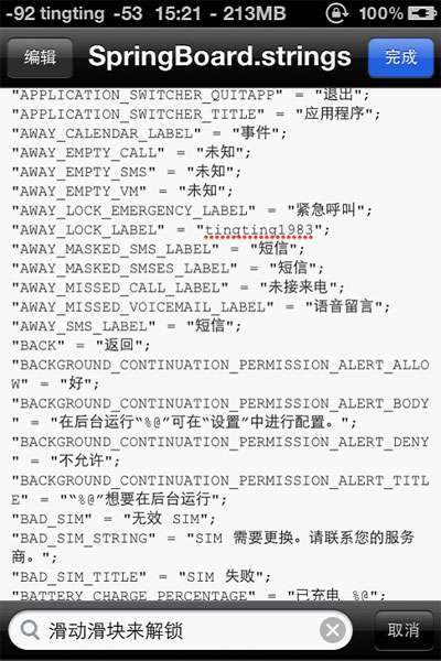 为啥我不用电脑来修改滑块文字呢?因为SpringBoard文件用记事本打开是乱码,所以只有借助iFile来修改。其实主题的天气城市等等也是可以使用iFile来修改的,这个我就不在这里介绍了。