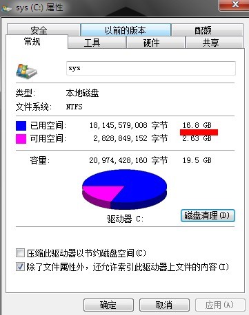 - 点击属性,会弹出属性界面对话框如下图,看到在常规下会有个磁盘清理。