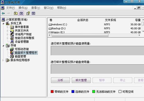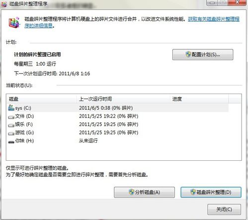 - 弹出磁盘碎片整理程序,可以看到有配置计划,分析磁盘,碎片整理等按钮。