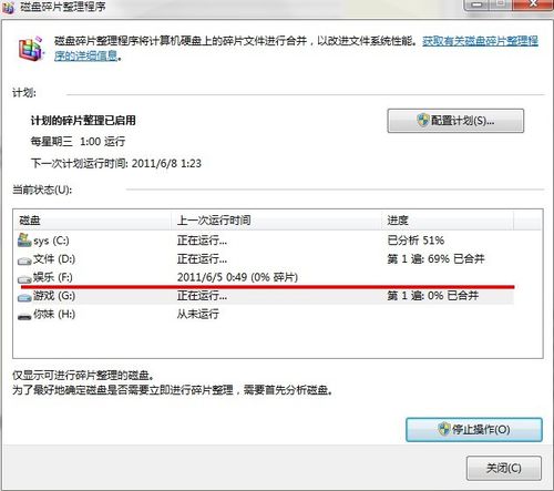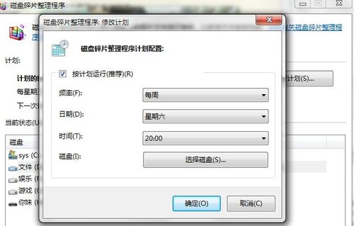 - 点击配置计划可以看到设置每个星期自动磁盘碎片整理(又一次见到WIN7的人性化),当然如果你不喜欢的话可以不招待这个计划。