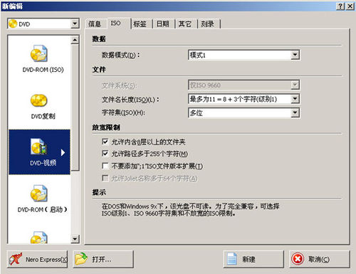弹出新编辑对话框,在对话框左上方可以选择你的光盘类型(CD或是DVD),如图