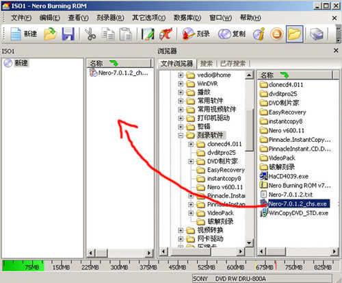 这时只需在文件浏览器中找到自己想刻录的文件直接拖到图中红色键头所指的区域就可以了,然后点击上图上方的按钮就可以进行刻了!
