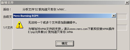 NERO支持的音频文件有WAV、MP3、MPA等,但是如果不是标准的MP3格式或是其它音频格式NERO的自动侦测文件功能就会提示文件类型出错,如图