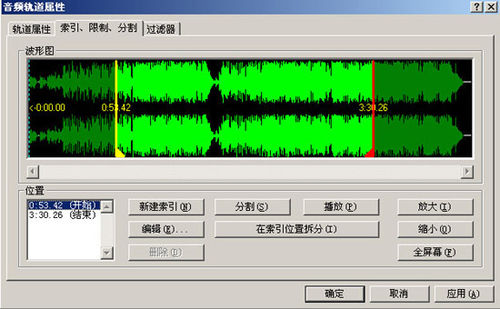 切换到“索引、限制、分割”界面还可以对所选定的音乐进行编辑,如从什么时候开始什么时候结束等。