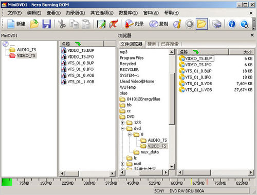 NERO还是不能直接支持MPEG2文件,只能把它支持的文件如BUP、IFO、VOB等文件拖到DVD视频文件夹VIDEO_TS里,如上图所示,如图生成DVD文件夹及BUP、IFO、VOB等文件