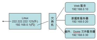 一般访问量比较大的网站都会由几台服务器分担各项工作,例如将防火墙、web服务、数据库服务、文件服务各由一台或多台服务器运行,如下图: