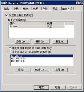 - 添加了snmp服务之后,需要设置安全选项,否则控制端将连接不了snmp服务。在 计算机管理->服务 列表里可以找到 "snmp服务" 一项。从服务的”属性“进入,选择”安全“标签页,添加一个接受团体的名称,一般添加”public-只读“,我这里添加的是”linsaw-只读“,然后在”接受来自这些主机的snmp数据包“里加入控制端服务器的ip地址——192.168.0.10。