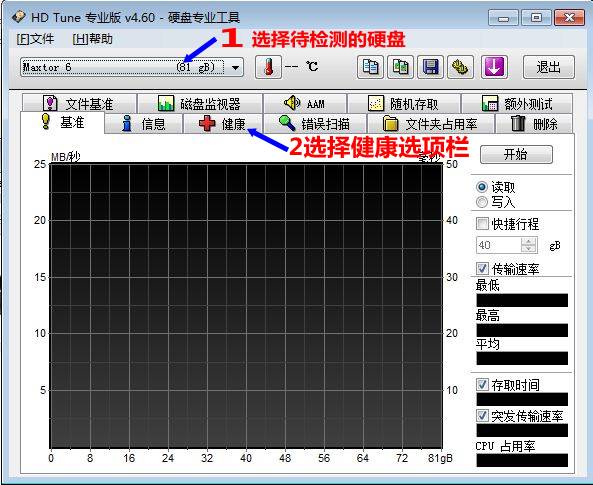 3.选择待测试的硬盘,然后选择健康选项栏。