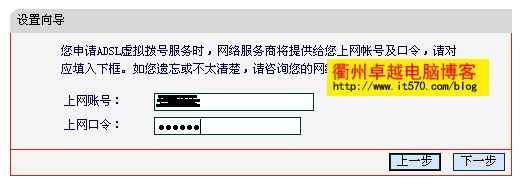 接下来输入网路运营商分配的上网帐号及口令后点击"下一步" 。