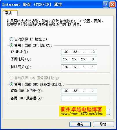 窗口中输入IP地址:192.168.1.X (X在2-254之间都可)、网关填写路由器的IP地址、DNS填当地的网络运营商或填路由器IP也可以。现在的路由器一般都默认开启DHCP服务,选择自动获取也能的到IP地址。