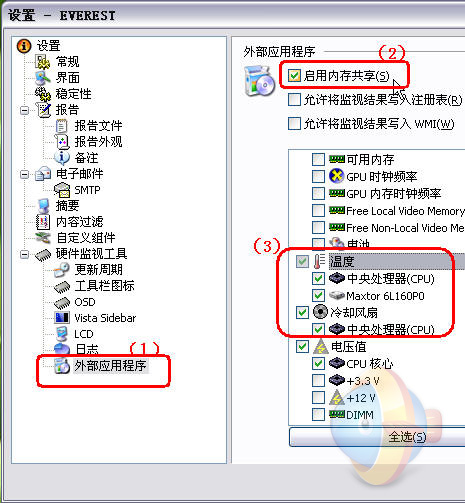 3、在打开的Everest设置窗口中,点击左侧树形列表底部的“外部应用程序”(图二中(1)处),然后勾选右侧顶部的“启用内存共享”(图二中(2)处),然后勾选右侧底部列表中“温度”(图二中(3)处)