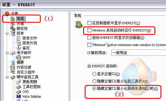 4、如果需要开机自动启动Everest,建议按图三中设置: 点击左侧顶部“常规”(图中(1)处),然后选择右侧底部的“隐藏主窗口(最小化到任务通知区域)”(图中(2)处)。 也可以勾选图中右侧顶部的“windows系统启动是运行everest”来实现开机自动启动everest 。