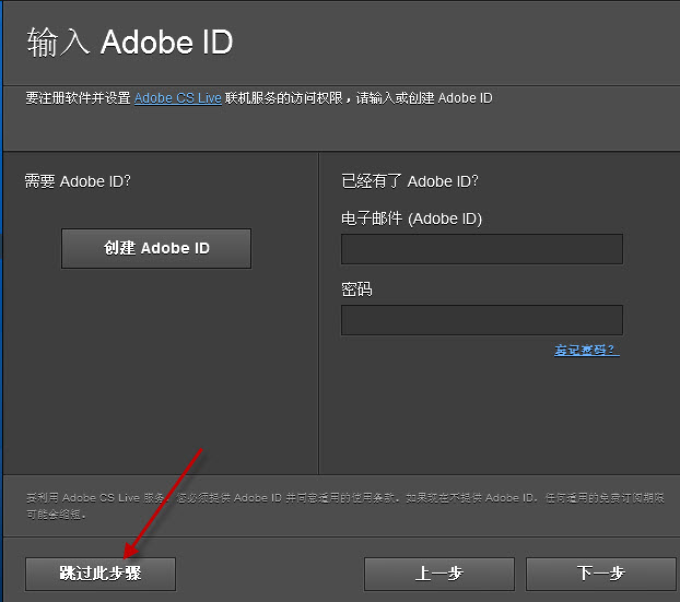 6、点击下一步,会要求输入adobe ID,不用管它,直接选择"跳过此步骤"