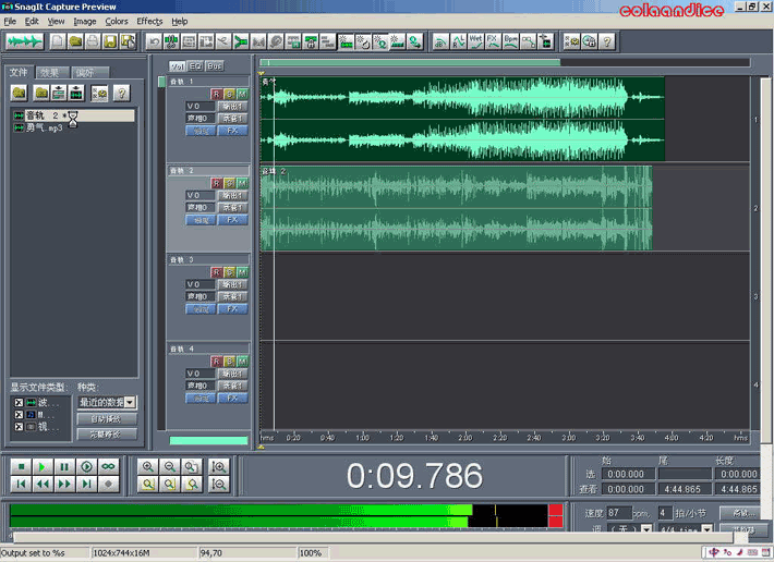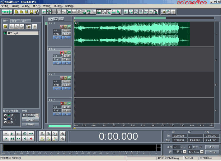 1.打开CE进入多音轨界面右击音轨1空白处,插入你所要录制歌曲的mp3伴奏文件,wav也可(图1)。