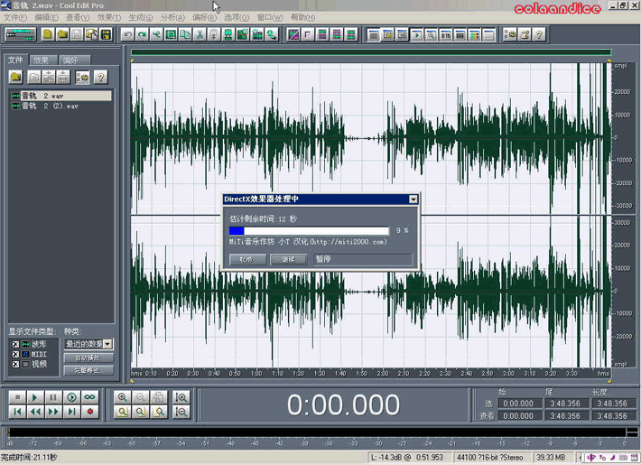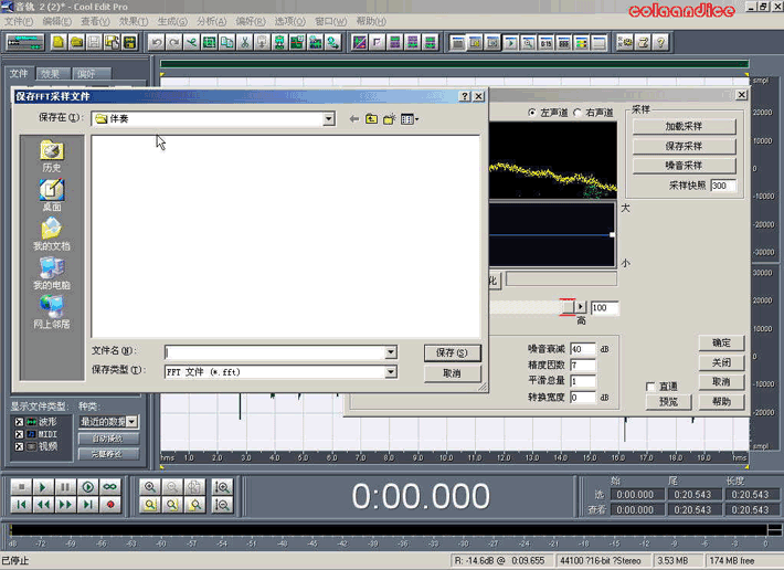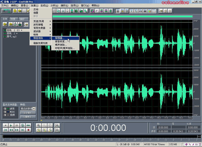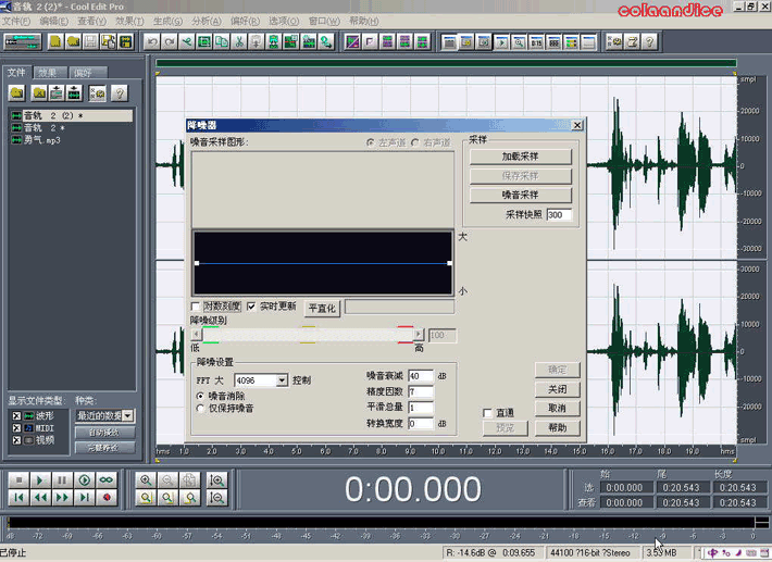 8.回到处于波形編辑界面的人声文件,打开降噪器,加载之前保存的噪声采样进行降噪处理,点确定降噪前,可先点预览试听一下降噪后的效果(如失真太大,说明降噪采样不合适,需重新采样或调整参数,有一点要说明,无论何种方式的降噪都会对原声有一定的损害) (图13 图14 图15)