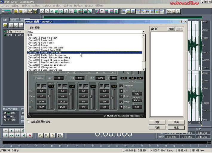 1.点击"效果--DirectX--Waves--C4"打开WaveC4压限效果器(图19)。