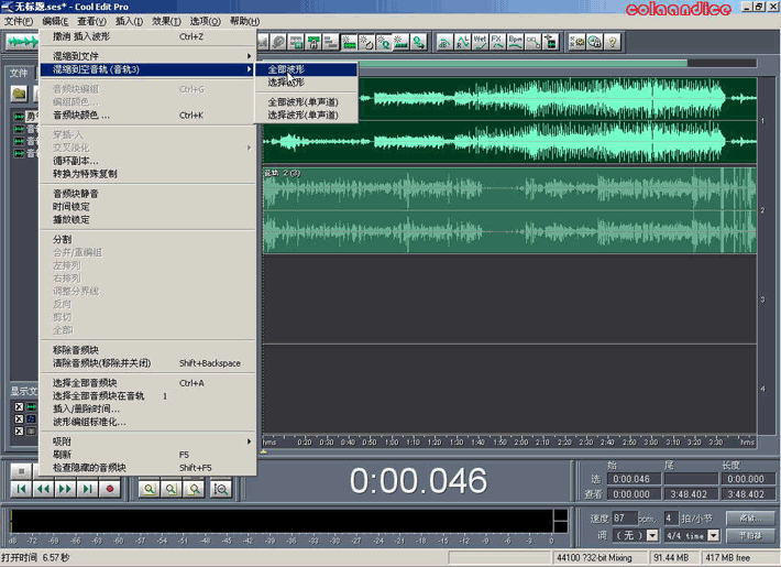1.点"编辑--混缩到文件--全部波形"便可将伴奏和处理过的人声混缩合成在一起(图24)。