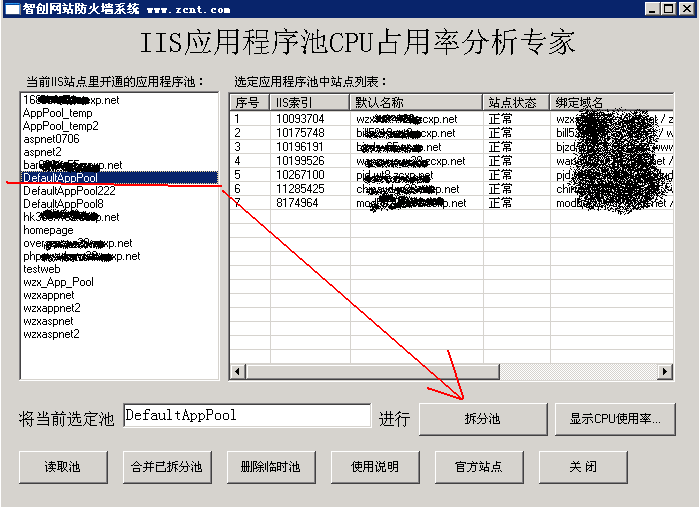 点有问题的应用程序池,然后右边列出这个池中的站点,点“拆分池”