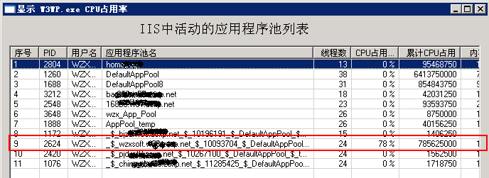 有一个应用程序池,cpu占用率长时间高达 70-80%,累计CPU站用时间也特别高