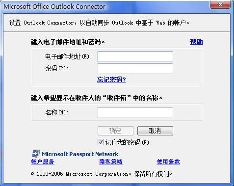 先关闭outlook再安装插件,装完后打开outlook,会自动跳出下面一个窗口,很简单,直接输用户名,密码点确定就搞定。而且会在你的邮件上独立一个文件夹出来,非常实用,就省设置很多规则策略。你也可以在outlook工具栏上找到Outlook Connector做同样设置