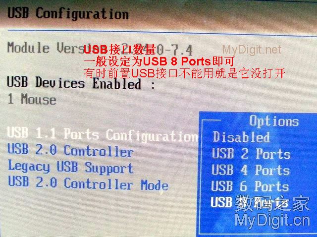 以下各项均在Advanced、Integrated Devices、USB Configuration菜单下
