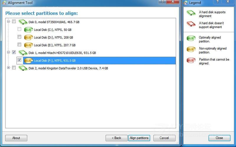 安装 Paragon Alignment 后,运行,如下图,可以看到左侧是你的硬盘,而右侧,则是说明,如果显示绿色,则是已经对齐4K,而显示黄色,则是可以对齐4K,但未对齐,而粉红色的,则是不支持高级格式化,也就是对齐4K也没用。