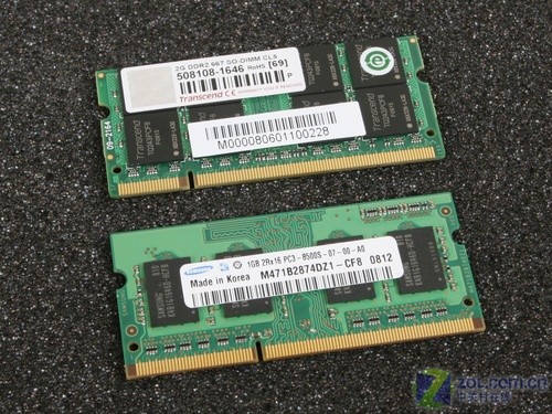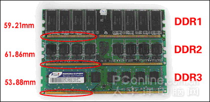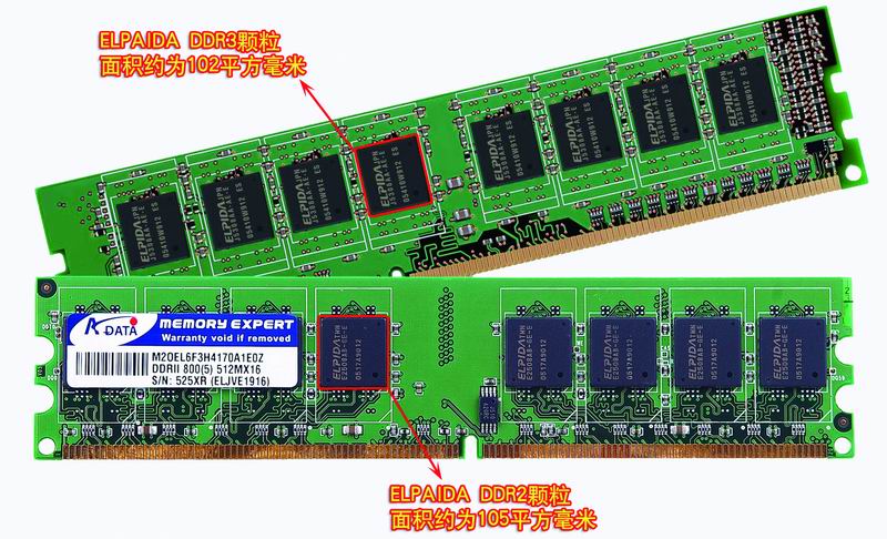 DDR2和DDR3内存的颗粒为正方形,而且体积大约只有DDR内存颗粒的三分之一