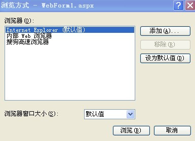 默认的调试浏览器变成了搜狗的浏览器了,我在vs的设计页面中添加任何控件元素在调试的时候都浏览器里看不到。而且cs文件中的后台的代码页对页面的显示起不到任何作用,即使一个lable的text也改变不了。觉得很奇怪,以为是自己的系统出毛病了,折腾了好几个小时。后面想到可能是vs调试时只能用IE(毕竟都是微软的),果然我将调试页面的地址拷贝到IE的地址栏中,一切都正常。