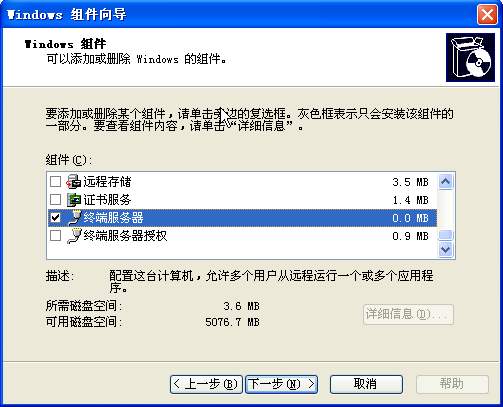 第一步:点击“开始→设置→控制面板”,运行“添加或删除程序”,进入“添加/删除Windows组件”选项页,在“Windows组件向导”中勾选“终端服务器”(图2)。系统会弹出一个提示框,点击“是”即可。随后显示终端服务的介绍窗口,点击“下一步”。