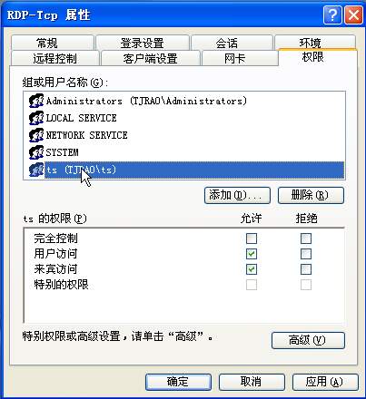 最后,在“权限”框下方的“ts的权限”列表框中勾选“用户访问”和“来宾访问”的允许访问权限,这样就可以赋予“ts”用户组访问终端服务器的权限。
