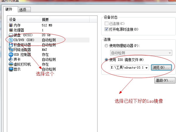 然后选择下一步----下一步---然后选择硬件配置,会打开下图的对话框,如果没有的话,那就单击虚拟机菜单,选择虚拟机配置