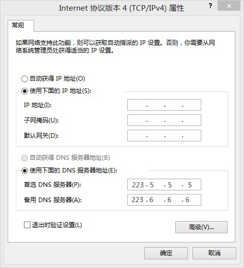 选择使用指定的DNS,在DNS服务器地址中输入223.5.5.5 和 223.6.6.6,输入后确定退出即设置完成。