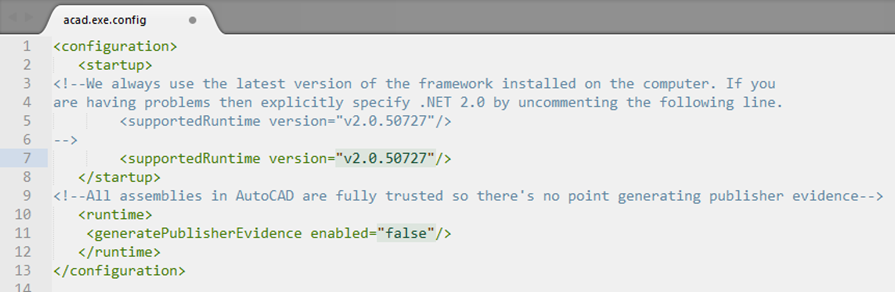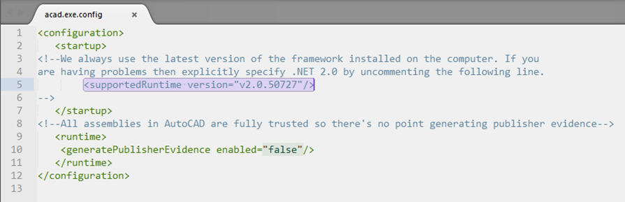 修改AutoCAD的配置文件,这个文件在AutoCAD的安装目录下。打开配置文件(acad.exe.config)如下: