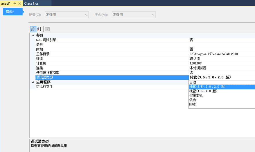 关于问题1,断点不起作用的原因归结为Visual Studio 2010不会选择正确的版本的调试器,在调试时启动了默认的window(v4.0),此调试器不会看到针对旧版本的.NET 项目中的断点,但是为了让我们的.NET应用程序能在AutoCAD 2010等上运行,我们需要.NET Framework 2.0( 3.5也是运行在CLR 2.0之上的)。