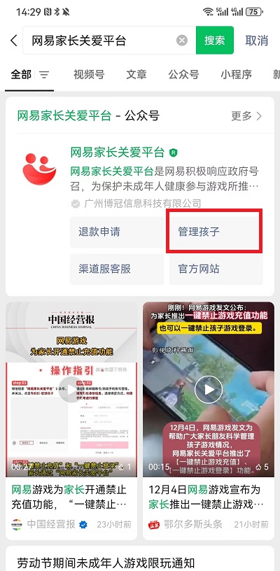 1、在微信中搜索【网易家长关爱平台】,进入到网易提供的家长管理平台,在搜索出现的结果中点击【管理孩子】进入到管理界面;