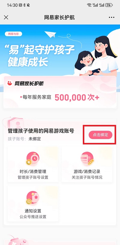 4、登录完成之后需要绑定孩子使用的网易游戏账号,点击界面中的【点击绑定】去进行绑定;