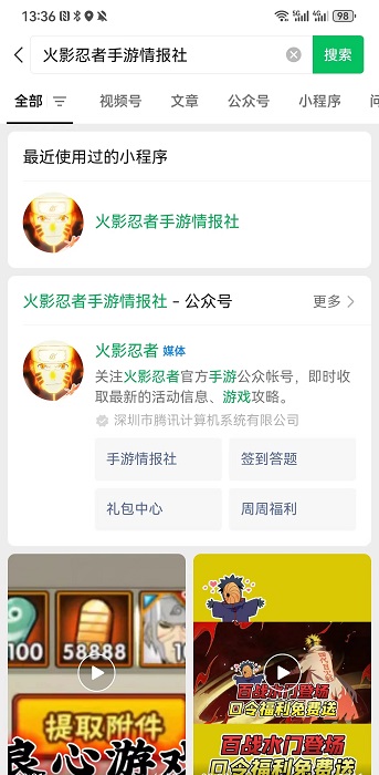 1、只有在QQ中的小程序才能绑定QQ,所以需要在QQ界面中搜索【火影忍者手游情报社】进入到小程序之中;