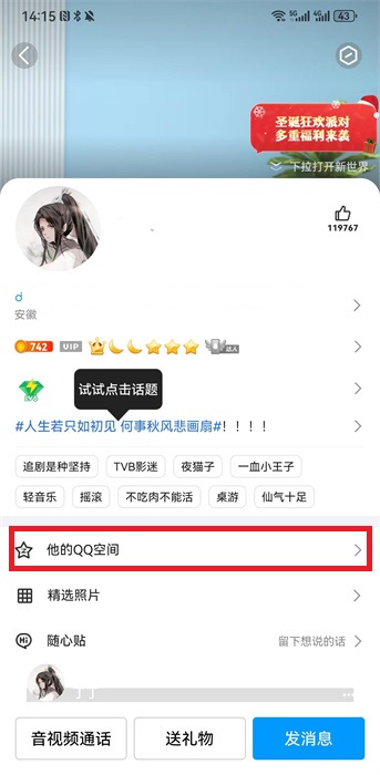 3、在对方的资料界面中,点击对方的【空间】,就可以进入到空间动态中;