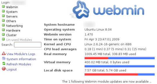 Webmin由不同的模块组成,每个模块执行选定的任务。有查看系统状态、配置grub、管理防火墙和协议、配置服务器等更多模块(完整列表)。另外你可以根据自己的需求添加其他模块,也可以使用Webmin的API和一些编程知识,为特殊的服务或者应用创建自己的模块。