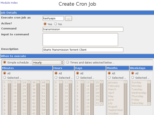 要创建任务,店家“创建新预定时钟守护任务(Create a new scheduled cron job)”,你就会被带到创建预定任务的界面,你可以在这里指定命令和参数,指定任务执行的时间,而不用手动更改crontab文件。