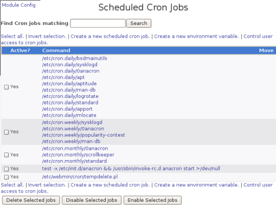 让我们看一下如何通过Webmin管理时钟守护任务。登录并且点击侧边栏“系统(System)”下的“调度时钟守护任务(Scheduled Cron Jobs)”。你就可以看到系统中所有的时钟守护任务列表,你可以将选定的任务设置为启用/禁用,或者删除/添加任务以及其他列出的功能。